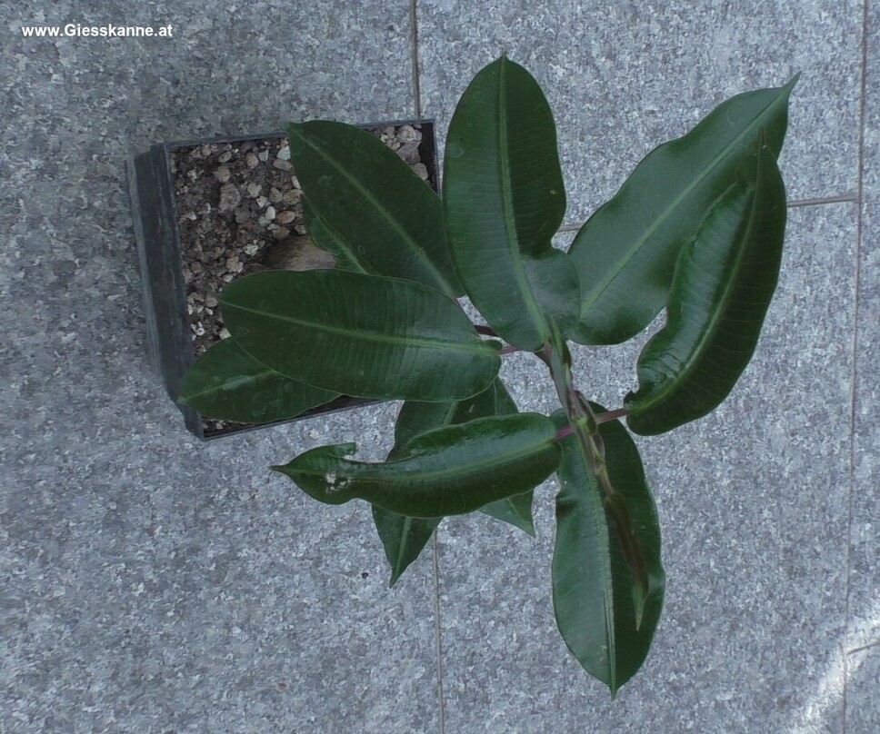 Im Winter dann maximal 1x pro Monat ein Schlückchen Wasser zuführen, in der Wachstumszeit kann man schon gerne wöchentlich (idealeerweise mit Regenwasser) gießen. Dabei aber „Überschwemmungen“ im Untersetzer vermeiden bzw. entfernen und die Pflanze immer gut abtrocknen lassen. Immerhin hat sie einen Kaudex und der verträgt keine Staunässe bzw. bringt die Pflanze auch durch längere Trockenphasen.