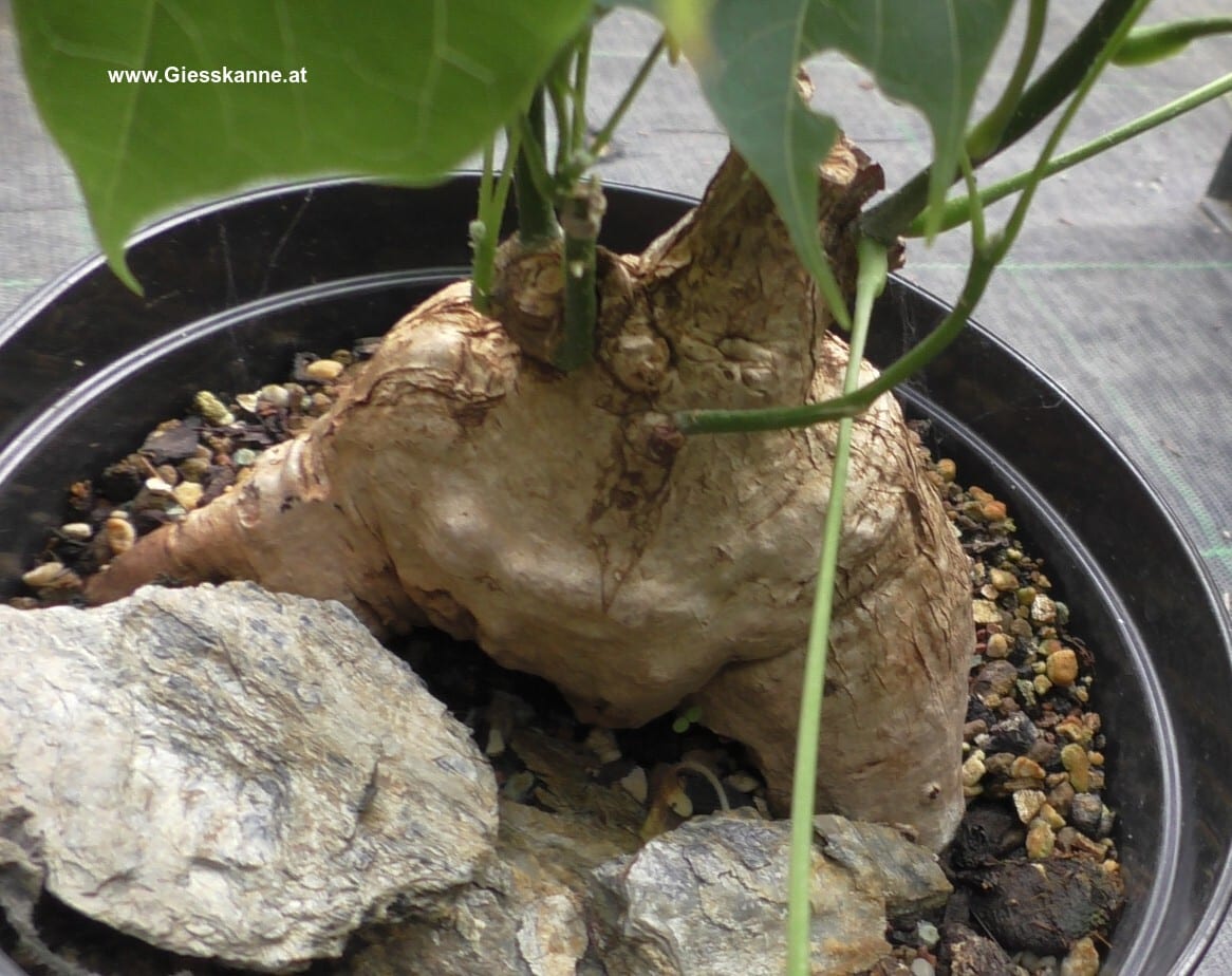 Beim Gießen gilt: Gut austrocknen bzw. zumindest (im Sommer) abtrocknen lassen – der Kaudex ist ja ein feiner Speicher und mag keine Überdosis an Wasser. Hier verwende ich ausschließlich Regenwasser.