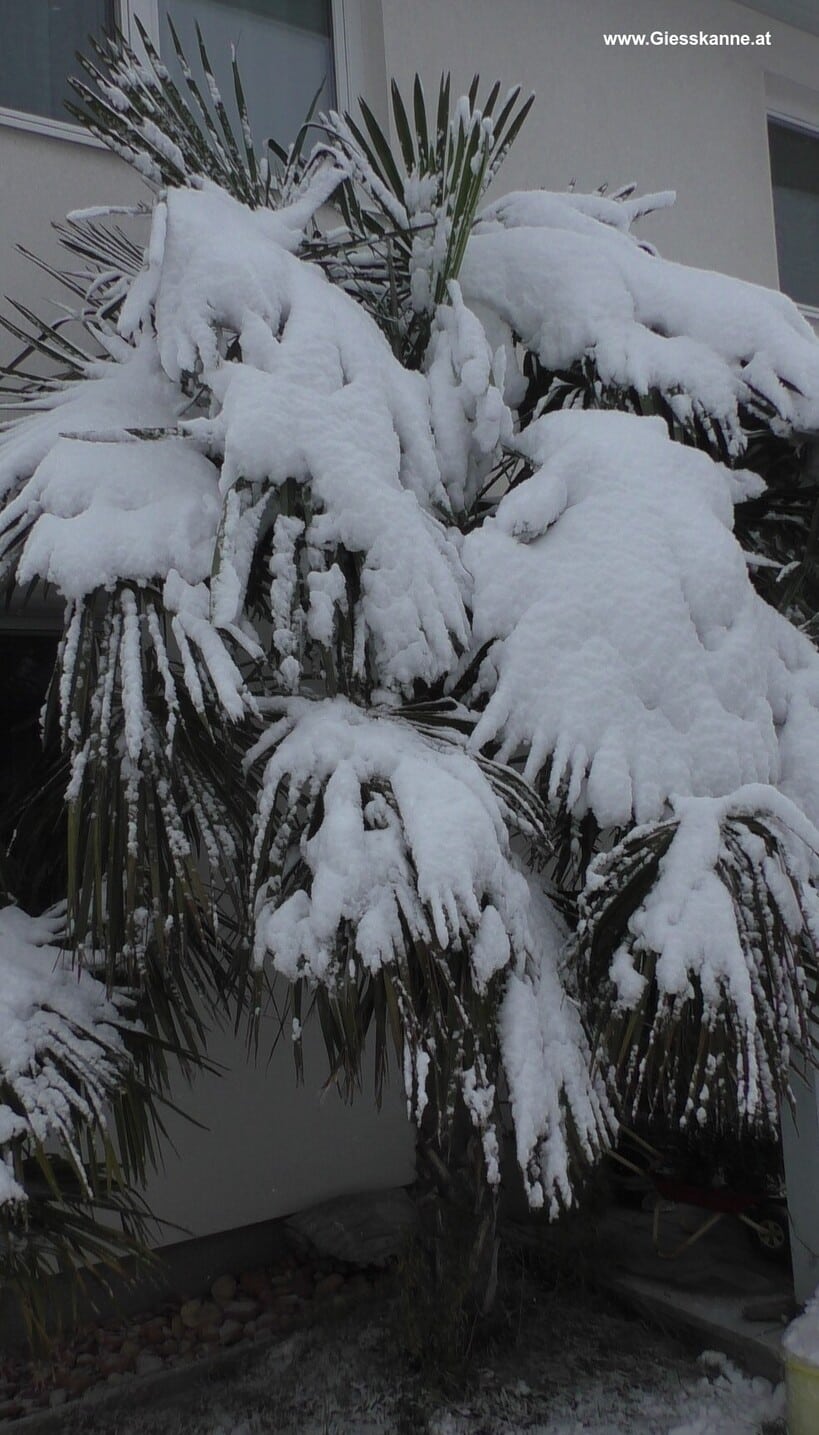 Nach sehr starken Schneefällen ist es auch durchaus ratsam, die Palme von der Schneelast zu befreien. So nett das oft auch aussieht (eine Palme im europäischen Winter hat schon einen gewissen Charme) – der Schneedruck belastet die Pflanze natürlich.