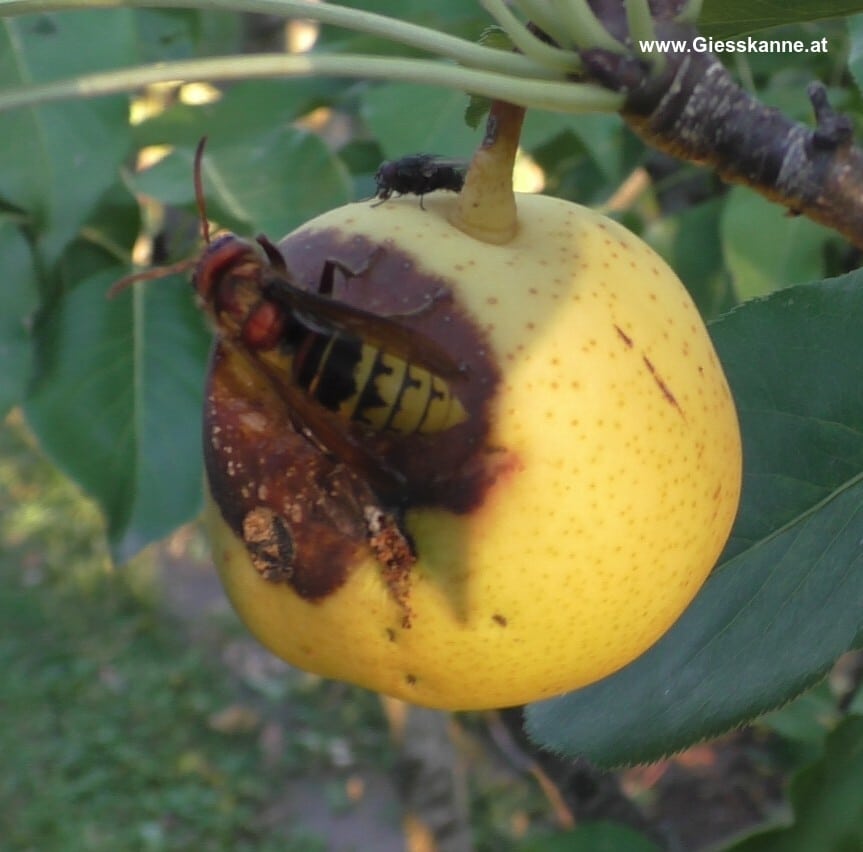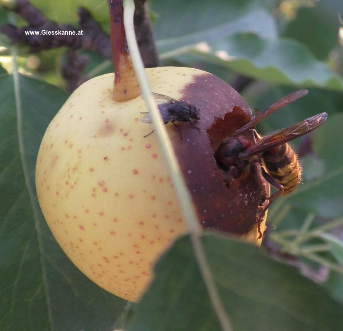 Verbreiten da und dort Angst und Panik – sind aber harmlos und nützlich: Hornissen. Hier eine Hornisse beim Speisen auf einer Nashi – die hier auch zu sehende Fliege verhielt sich sehr vorsichtig;-)