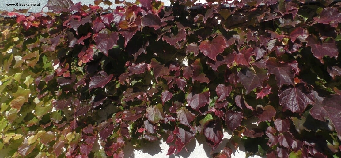 Manchmal Dekor für Hauswände (hier eine Garage): Der wilde Wein – auch „Dreispitzige Jungfernrebe“ bzw. als „Veitschi“ oder „Veitchii“ (nach Botaniker John Gould Veitch) bekannt.