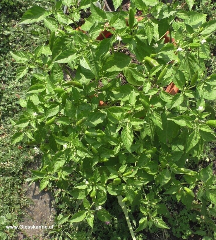 Im Zuge der Fruchtbildung bzw. schon bei der Blüte benötigen Chili und Pfefferoni auch deutlich mehr Wasser – Staunässe aber unbedingt vermeiden. Bei Topfpflanzen den Untersetzer weglassen bzw. nach stärkeren Regenfällen unbedingt ausleeren.